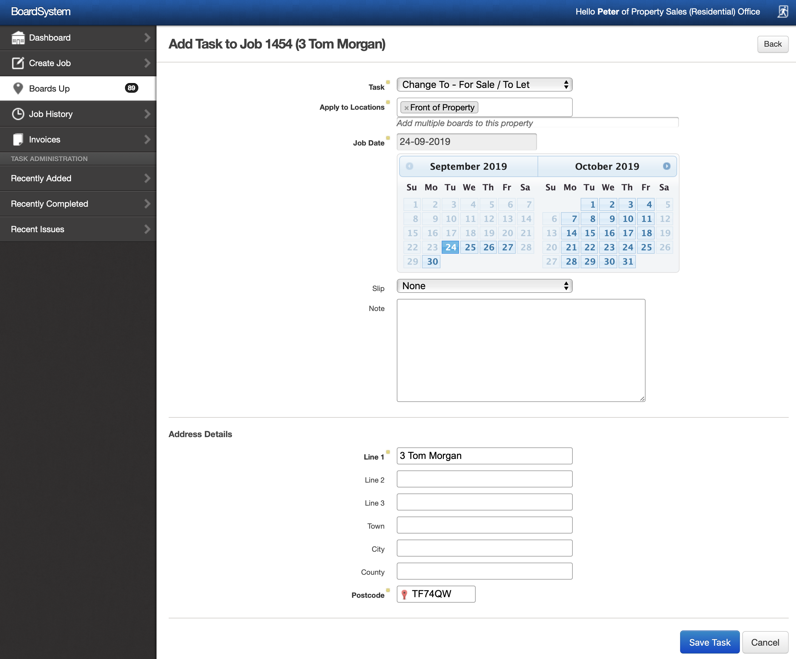 If you wanted to add more than one instruction to an address (for example, erect new For Sale and add a pointer at the bottom of the road) this is possible by adding tasks to an existing job. Do not create two jobs - the system will warn you of creating a duplicate.