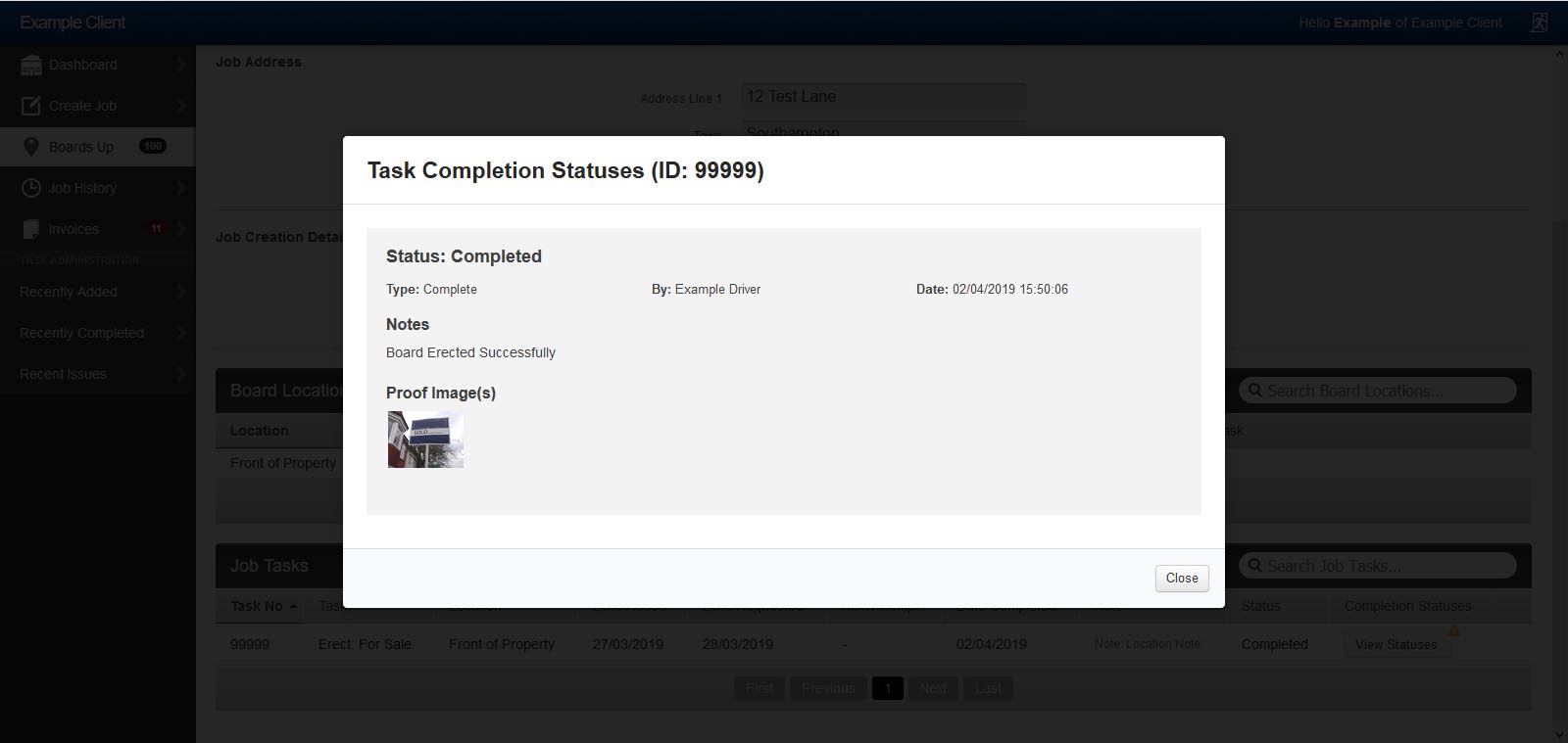 Clients can view uploaded proof images from within the "View Statuses" section of a task.