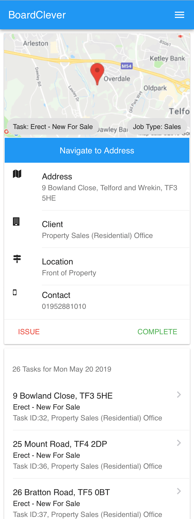 Using the Board Clever mobile web app your board erection drivers will be able to quickly and easily navigate to their daily jobs. Easily complete jobs, upload photos and report issues as they go.