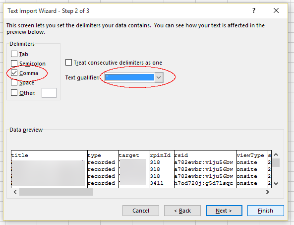 When exporting the CSV file from Excel you must ensure it has the delimiter set as a comma and the Text qualifier has a quotation mark " in the box.